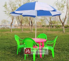 直径90cm圆桌 红桌绿椅带蓝伞